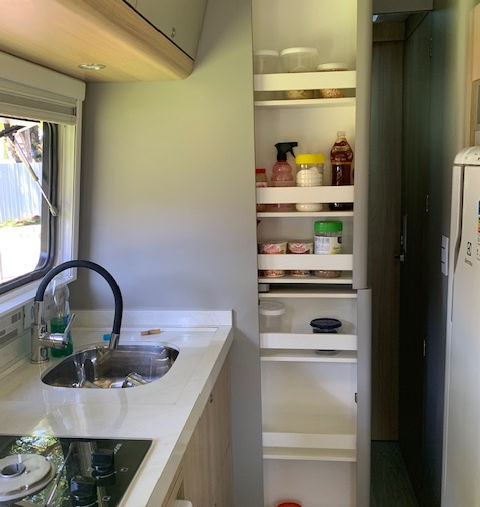 Estrutura hidráulica com 180L de água servida, 120L de água cinza e 70L de água preta com válvula manual. Amplo depósito traseiro com iluminação e torneira, com espaço para instalação de máquina de lavar roupa.